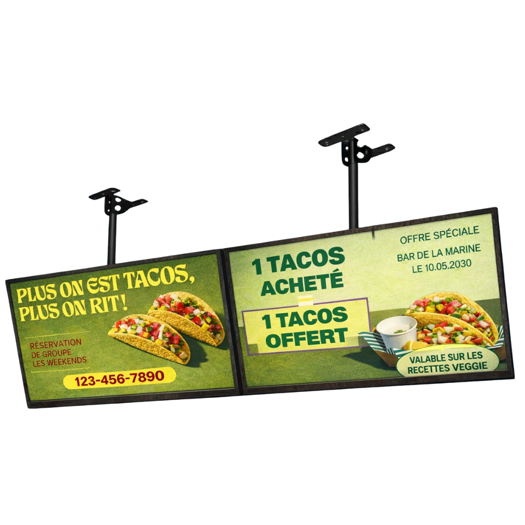 Le tarif dépend du nombre d’écrans, du type de support (mural, totem) et de votre configuration. Nous proposons des solutions adaptées à tous les établissements, des petits cafés aux franchises multi-sites. Demandez une étude gratuite pour recevoir un devis personnalisé sous 24h.